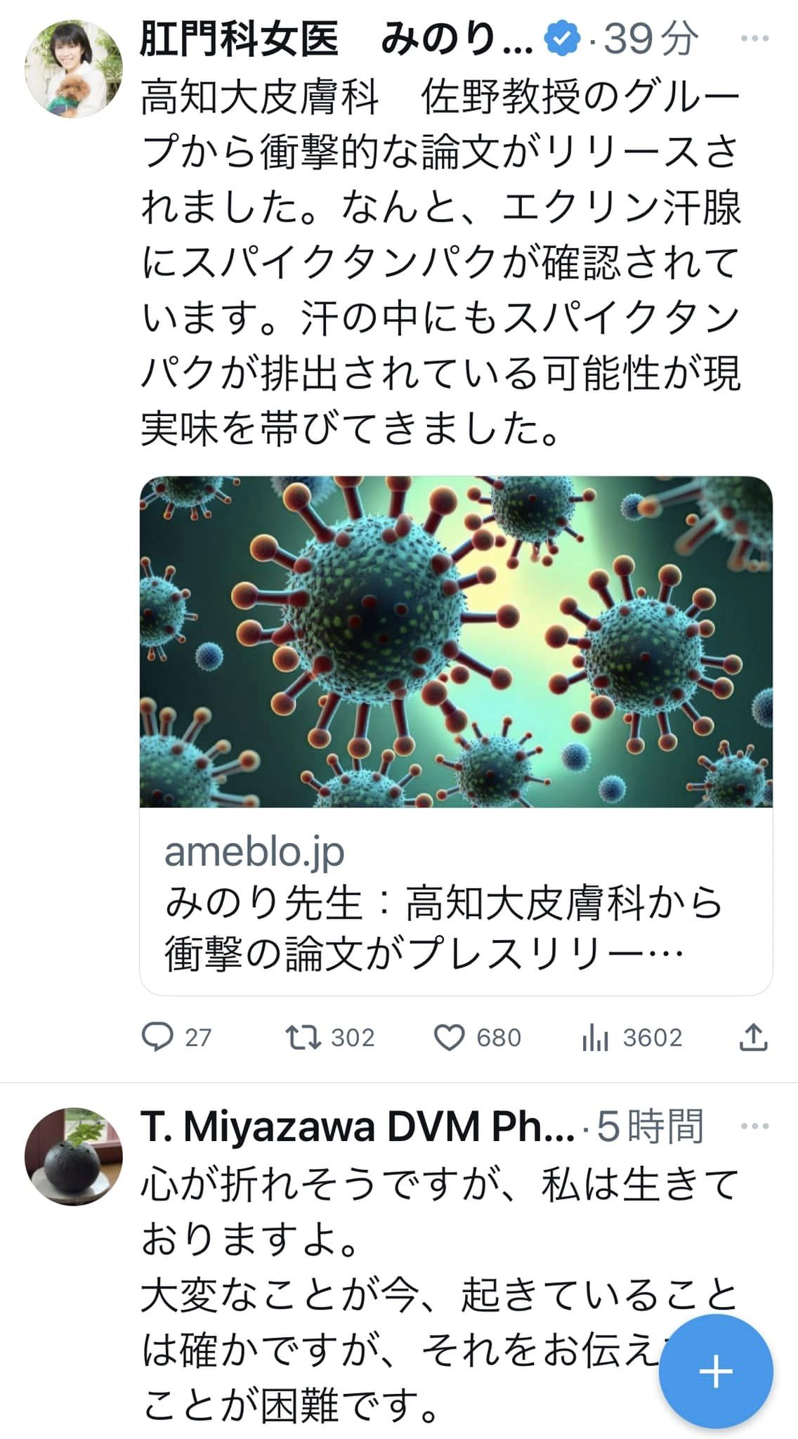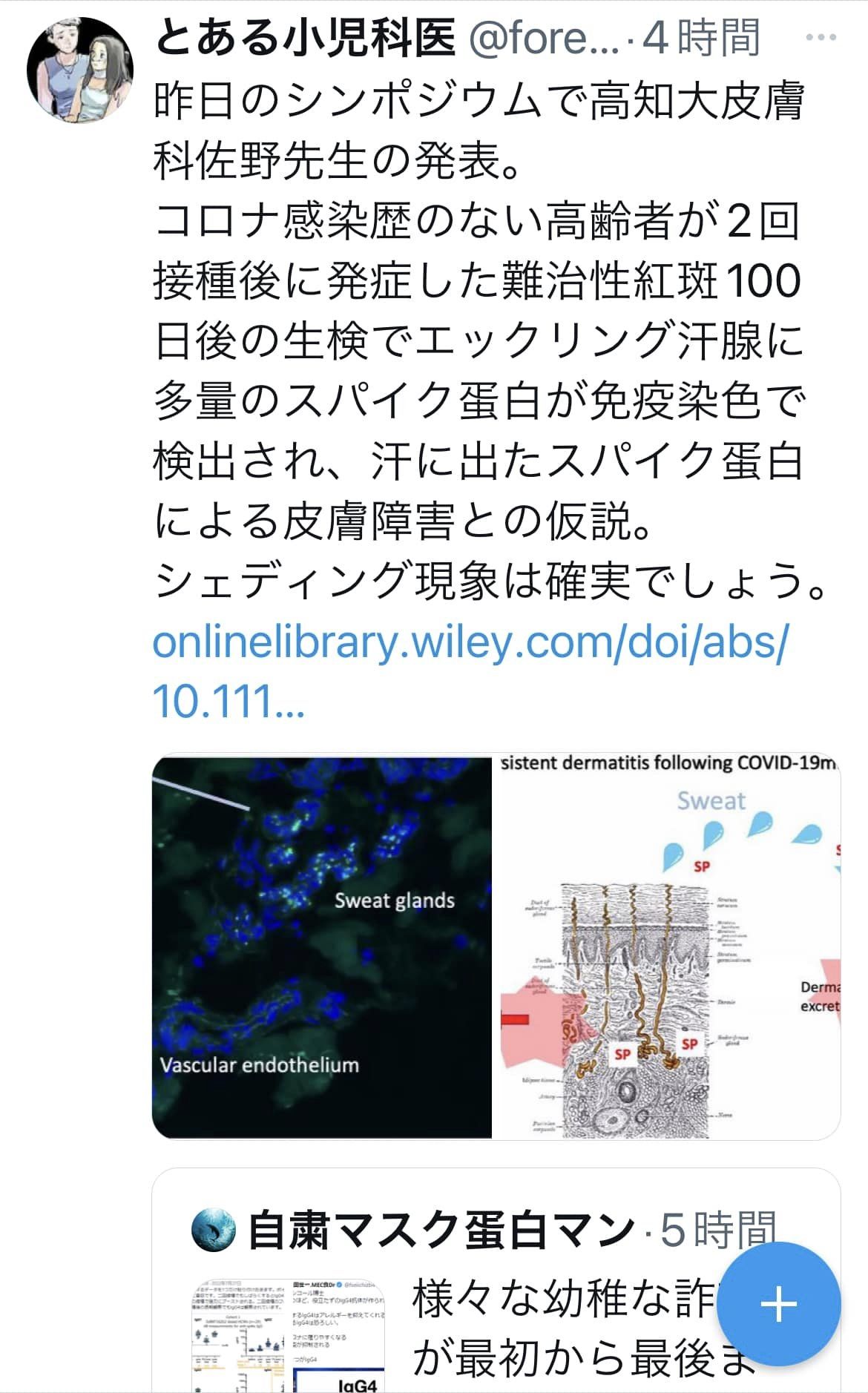 ファイザーの開発資料には記載されてあるが、なかなか接種後の学術論文出なかったが、昨日のシンポジウムで接種者の汗腺にSタンパクが検出、発表された。