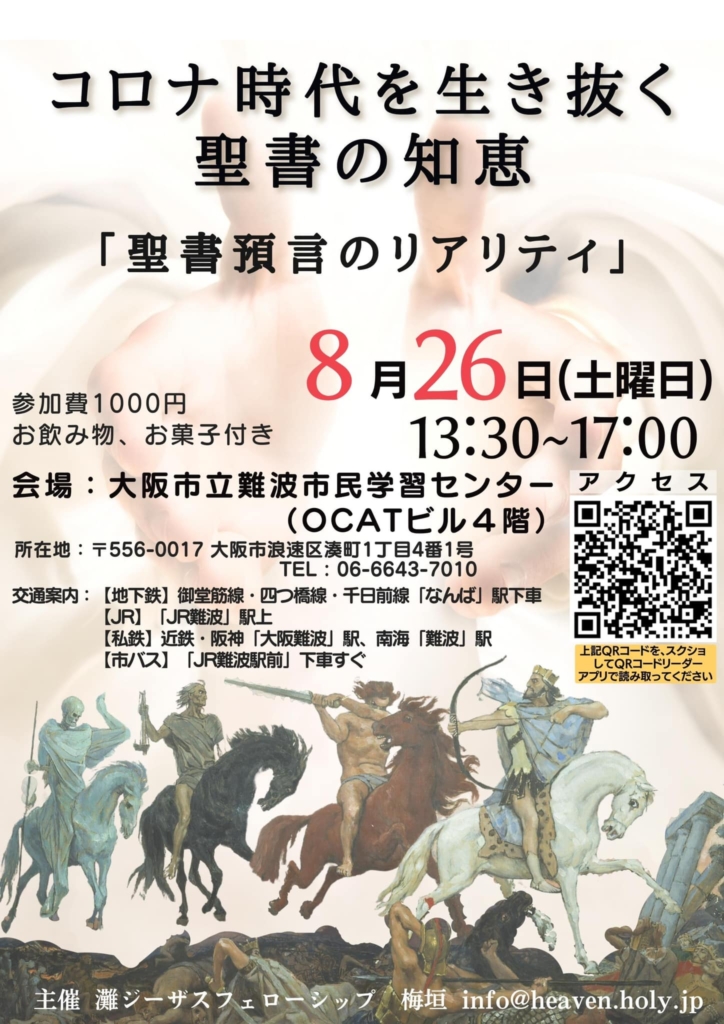 聖書預言のリアリティー コロナ時代を生き抜く聖書の知恵後 8月26日(土曜日)13:00~17:00 大阪市立難波市民学習センター(OCATビル4階) 参加費 1000円 お飲み物、お菓子付き ◀ポスター画像(画像クリックで拡大します) 会場までの案内... -