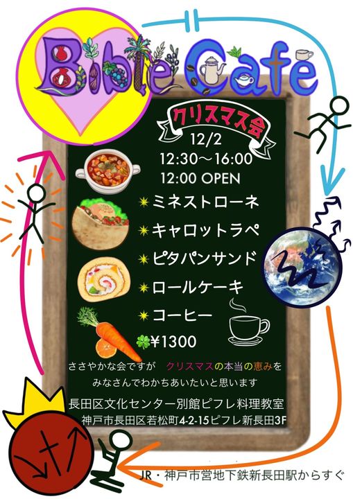 「バイブルカフェ、クリスマスランチ」 12月にささやかなクリスマス会を開きます。聖書預言チームが頑張って料理を作ってもてなしてくれるそうです。 先着30名となっております。 神戸方面の方いかがでしょうか? 🔻会場案内図GoogleMap -